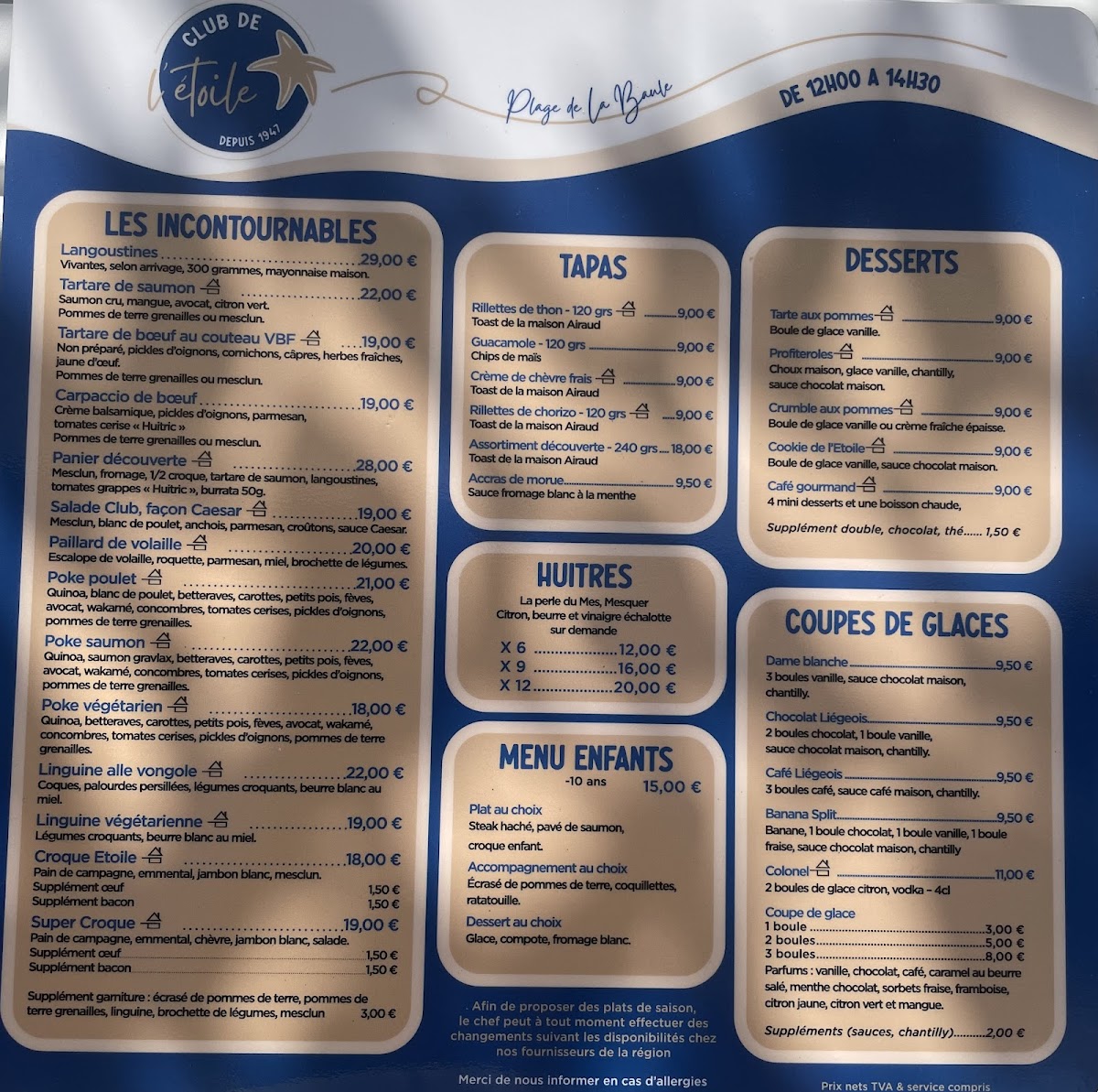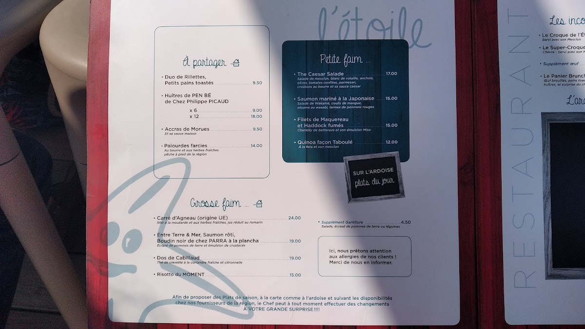 The menu at Club De L'etoile - Restaurant - Bar De Plage offers a delightful blend of flavors that highlight both classic and contemporary French cuisine, set in a picturesque location by the beach. Among the standout dishes, Sprit stands out as a refreshing drink option, perfect for enjoying the coastal ambiance. For those seeking a savory experience, the Galette Du Jour Épinards Chèvre Jambon Blanc Et Mesclun offers a delightful combination of fresh spinach, goat cheese, and ham, all balanced with a crisp salad on the side. If you are in the mood for something light yet flavorful, the Émietté de Crabe Et Guacamole is a top choice, with tender crab meat paired with creamy guacamole.